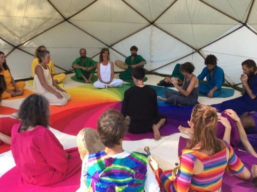 Nous avons élaboré une réunion de tous ces éléments, une quintessence réunissant le Yoga Arc-en-ciel dans le zome nomade, la sudation dans l'inipi et une cérémonie du feu sacrée Maya.